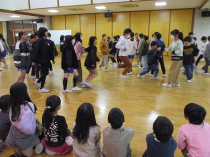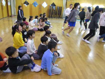 体力づくりの時間に、5年生の長縄跳びを見せてもらいました。速いスピードで連続で跳ぶ5年生の姿を見て、子供たちは驚いていました。さすが5年生です。