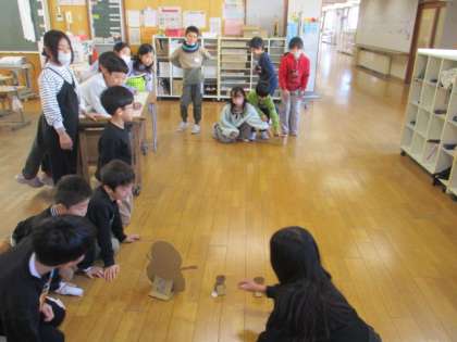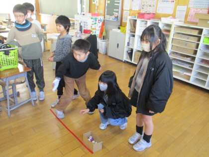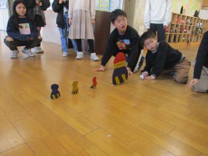 今日は節分なので、工作係さんたちが企画してくれた「節分的当てゲーム」をしました。鬼の的がとてもかわいいです。