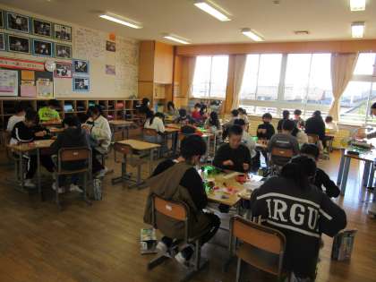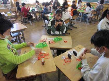 電磁石と磁石の性質を利用したモーターをつくりました。配線がうまくできているか確認しながら作業をすすめました。