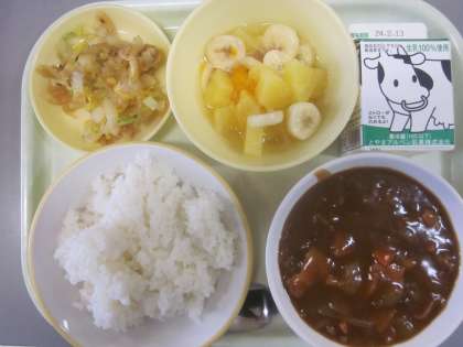 今日も献立は「食べキリンハヤシ、牛乳、福神和え、フルーツミックス」でした。