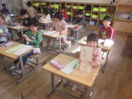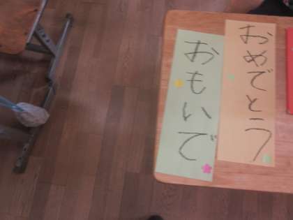 「心を込めて書こう!」 お祝いの言葉を書きました。 飾りを付けて完成です。