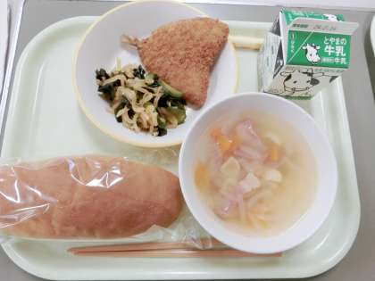 今日の献立は「コッペパン、牛乳、あじフライ、大根サラダ、マカロニスープ、棒チーズ」でした。
