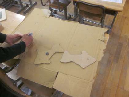 金魚すくい係です。段ボールを使って金魚をつくりました。