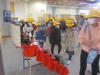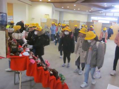 ひな人形前で立ち止まり、じっくりと見ています。
