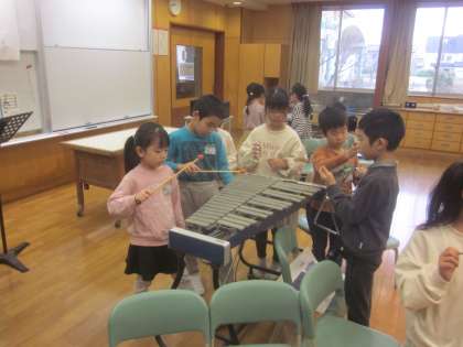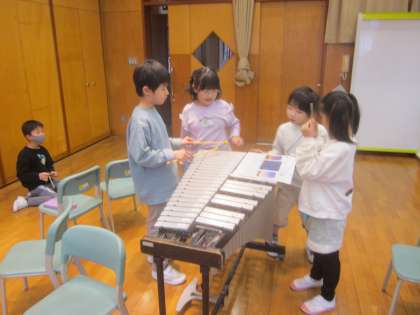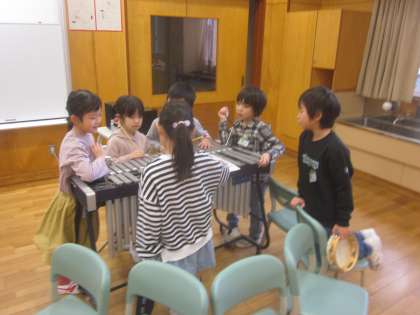 鉄琴、トライアングル、鈴などたくさんの楽器を使って演奏します。