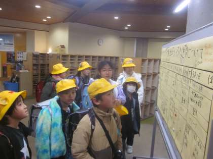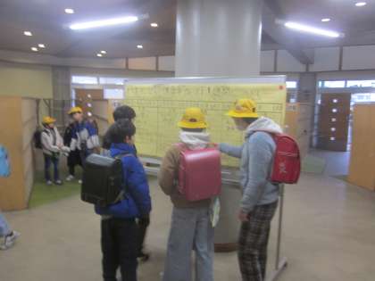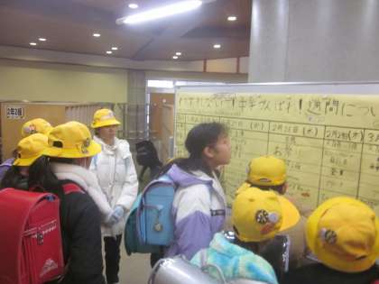 登校した子供たちは「わすれないで!中学がんばれ週間」の予定表を見ています。