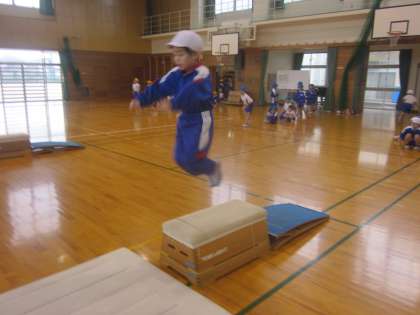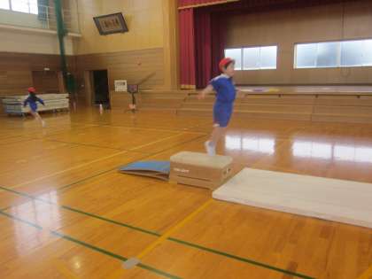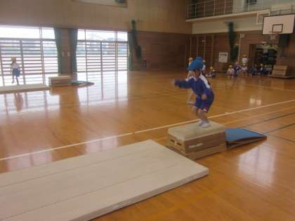 ロイター板を両足で踏み切り、跳び箱に乗ります。