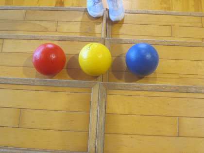 青は男子専用、赤は女子専用、黄は男女が使え、利き手ではない方で投げます。