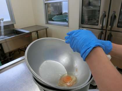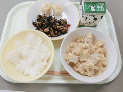 今日の献立は「ご飯、牛乳、にんじんシューマイ、ひじきの炒め煮、卵とじ」でした。卵は、殻が入らないように、1個1個、丁寧に割卵しています。今日もおいしくいただきました。