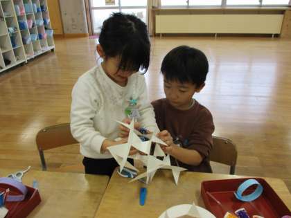 生活科の時間に、紙皿やストローを使って、「ストローひこうき」と「かざわ」を作りました。友達と協力する姿もたくさん見られました。