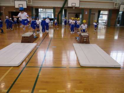 体育の時間に、跳び箱遊びを始めました。今日は、踏み切りの仕方や手の着き方を確かめながら、跳び上がり・跳びおりや、またぎのり・またぎおりなどの練習をしました。