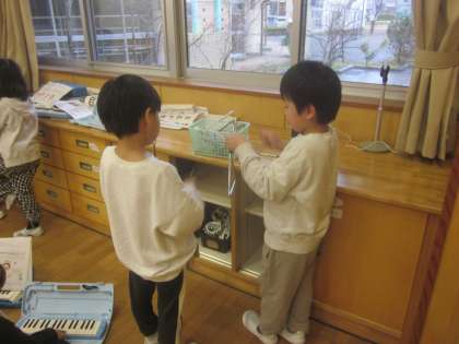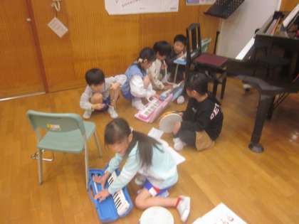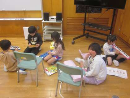 「とんくるりん ぱんくるりん」を鍵盤ハーモニカ、タンブリン、トライアングルを使って合奏しました。