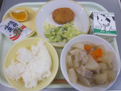 今日の献立は「ご飯、牛乳、コロッケ、グリーンサラダ、ポトフ、かんぺい、味付け小魚」でした。