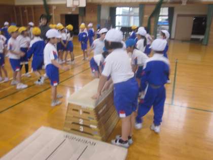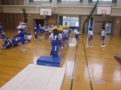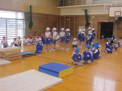 開脚跳び、ごろごろ下りなど、色々な動き方で跳び箱と仲よしになります。