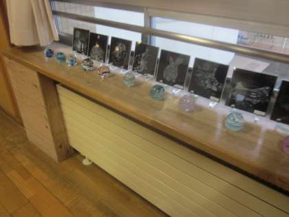 互いのスクラッチアート作品とペーパーウェイトを見合っています。