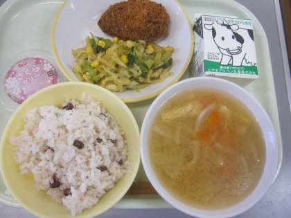 今日の献立は「赤飯、とんかつ、コーン和え、みそ汁、サクラゼリー」でした。