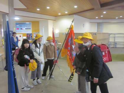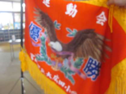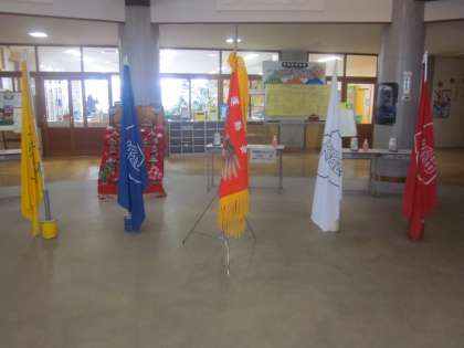 今日の「大広田オリンピック2023表彰式」で授与する優勝旗を展示しました。
