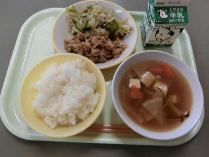 今日の献立は「ご飯、牛乳、豚肉の生姜焼き、ゆかり和え、けんちん汁」でした。ご飯によくあう生姜焼きで、おいしくいただきました。