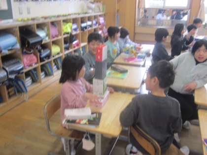 空き箱を積み重ねていき、どんな条件だと高く積めるかを考えました。