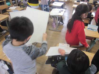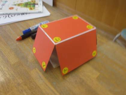 立体の頂点、辺、角度などを確認した後に、展開図を切り取って箱をつくりました。