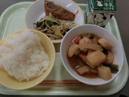 今日の献立は「ご飯、牛乳、魚の甘みそかけ、おひたし、関東だき」でした。給食室で鯖に米粉つけて揚げ、手作りの甘みそだれをかけました。甘みそは、みそ、砂糖、みりん、ねりごまで作ります。魚が苦手な子でも食べやすいとの声が多い人気のタレです。