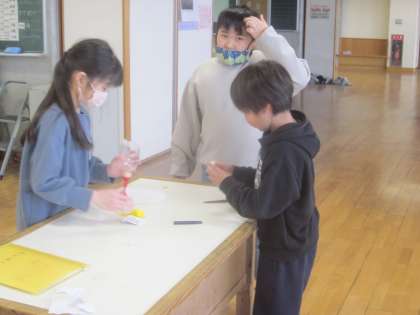 ゴムの力を使ったおもちゃをつくっている係