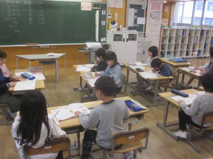 先生が黒板に書いた問題をノートに写し、解いています。