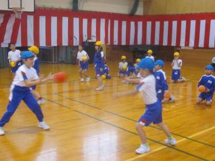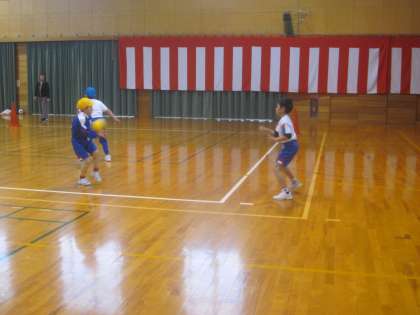 ペアでボールをパスしながらリレーをしました。 息を合わせて走ります。