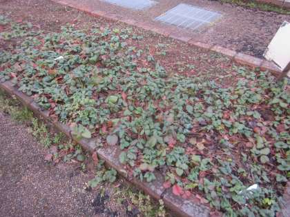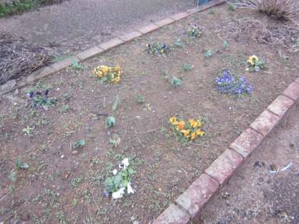 冷たい風が吹いていますが、花壇の花やいちごは元気です。