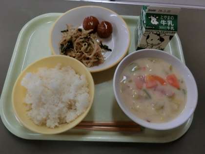 今日の献立は「ご飯、牛乳、肉団子の甘酢あん、ナムル、白菜の中華クリーム煮」でした。今日もおいしくいただきました。
