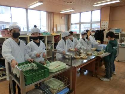 3年生は、PTAで購入していただいた新しい白衣を着てうれしそうに配膳していました。