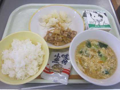 今日の献立は「ご飯、牛乳、豚肉のキムチ炒め、粉ふきいも、中華かき玉汁、味付け小魚」でした。