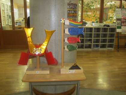 かぶとと鯉のぼりを飾りました。用務員さんの手作りです。