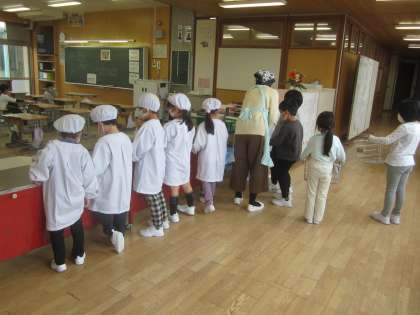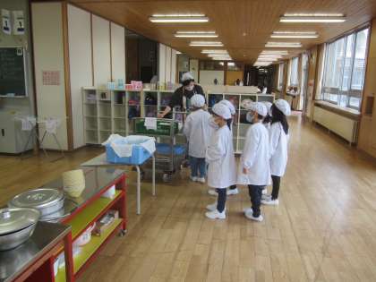 小学校での給食のスタートです。当番の仕事についてお話をしっかり聴いています。