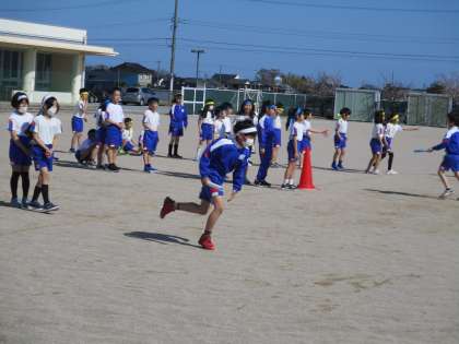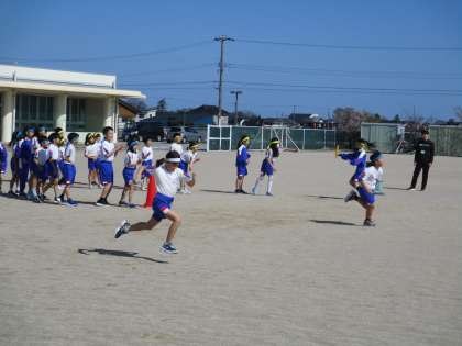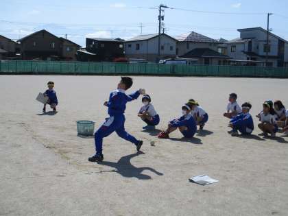 体育の時間にソフトボール投げと新しい色団でのリレーをしました。