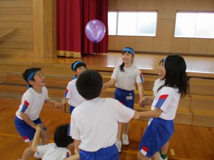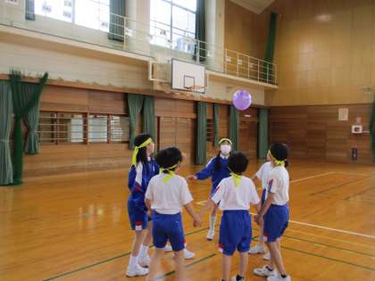 風船を落とさないようにチームで協力します。