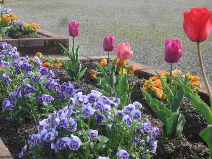 気持ちのよい1日のスタートです。朝方の雨で、花壇の花もより色鮮やかに見えます。いそなみ・しらゆき級の畑のいちごが小さな実を付けています。