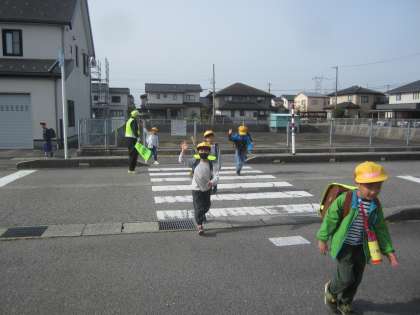 子供たちが元気に登校してきました。横断歩道の渡り方に気を付けています。