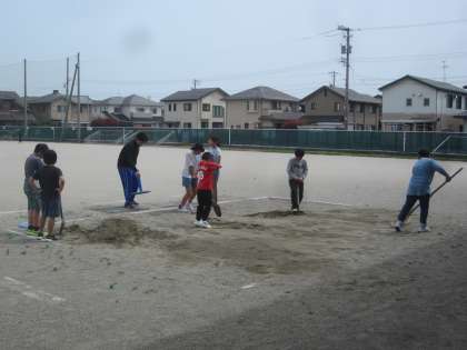 5年生は体育科で走り幅跳びの学習をします。安全に活動するための準備を進んでする子供たちの姿がありました。