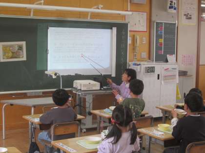 今年度の広運児童会のスローガンを決めるために、6年生が案を考えて、全校に放送で呼びかけました。写真は、放送に合わせてプレゼン資料を見ている1年生の様子です。