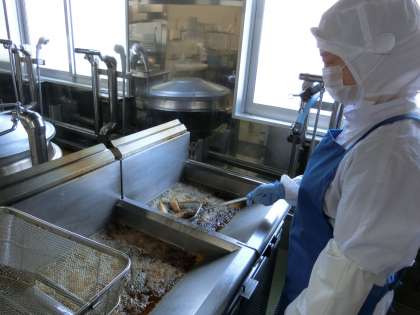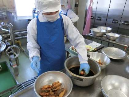 今日の揚げ魚のレモン味を作っている様子を撮影しました。ホキという白身魚に米粉を付けて揚げ、レモン汁を使ったしょうゆ味のたれを絡ませました。今日もおいしくいただきました。
