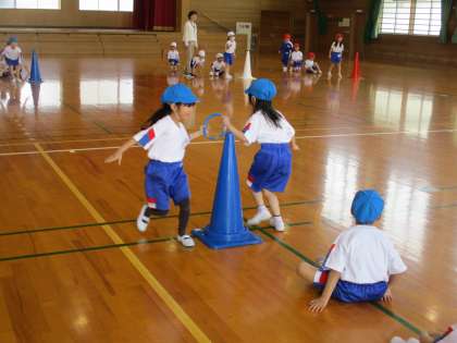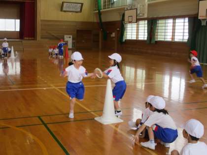 体育で初めてリレーをしました。リングのバトンを次の人に渡そうと一生懸命走りました。うまくバトンがつながりました。