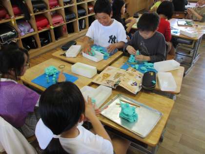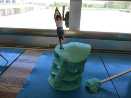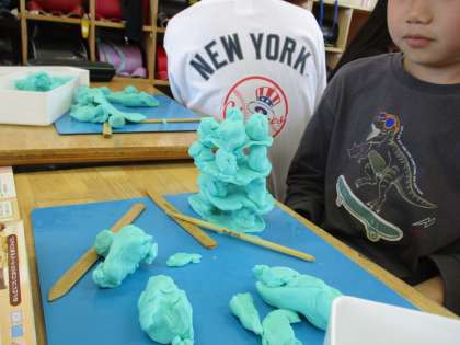 粘土を丸めたり、小さく切ったものをつみあげたりしながら高いタワーを作りました。できたタワーに小さな自分をつけて、完成です。