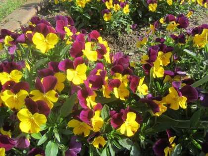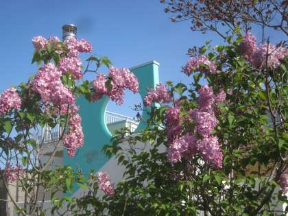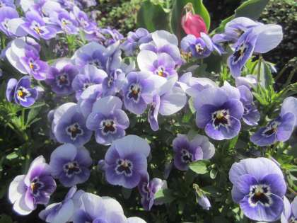 花壇のパンジーが色鮮やかです。ライラックの花も咲いています。