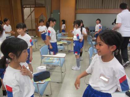「Hello.」「How are you?」クラスの先生や友達に挨拶をしました。「I'm fine.」「I'm sleepy.」「I'm hungry.」自分の状態にあった返事をしていました。