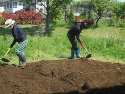 学習に使う畑の下準備を、用務員さんと教頭先生がしてくださっています。