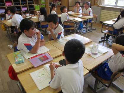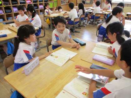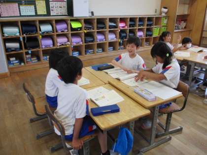 国語科「たんぽぽのちえ」で順序を表す言葉がたくさん出てきました。その言葉などを使って、朝からやってきたことを順序正しく話しました。グループごとに楽しそうに話している様子を撮りました。