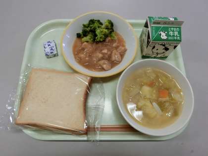 鶏肉のレモン煮は、砂糖、しょうゆ、酒、レモン汁で鶏肉とたまねぎを煮込みました。レモンの酸味であるクエン酸は疲労回復効果があります。今日はしっかり体を休めて、明日の運動会に備えましょう。