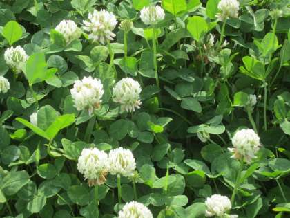 学校の敷地内に、シロツメクサが花を咲かせています。四つ葉のクローバーを見付けて、教えてくれた子もいました。