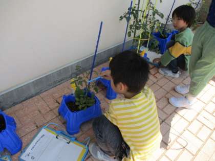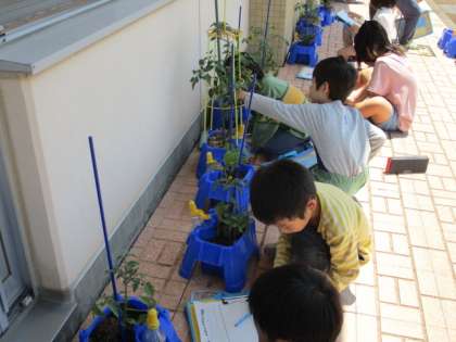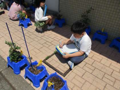 野菜の苗が大きくなりました。茎が伸びていたり、プチトマトの実がなっていたりと嬉しい発見がたくさんありました。その様子をしっかり観察し、絵や文に表しました。